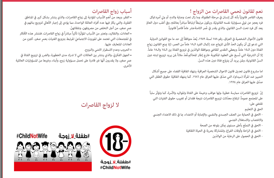 وكذلك ضمن نشاطات الحملة قام الشباب المتطوعين ضمن المركز السلم المجتمعي بتوزيع الآلاف من البروشورات حول زواج القاصرات وأخطاره وكذلك شرح وتوعية حول نتائجه وأضراره على الفتاة خاصة والمجتمع عامة مع كل من يلتقون به في الاماكن العامة او الدوائر الحكومية كقطاع بعقوبة الصحي والمعاهد والجامعات ، وكانت ردود فعل الناس متجاوبة حول الموضوع وكذلك أبدوا رأيهم وتجاربهم حول هذا الموضوع.