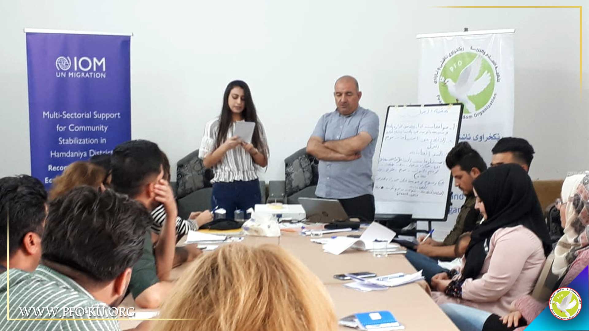 ضمن مشروع "كلنا نحب سهل نينوى" اقامت منظمة السلام والحرية بدعم من منظمة الهجرة الدولية IOM بتنظيم ورشة تدريبية ل 24 شباب من مركز قضاء الحمدانية – قرةقوش ومن مكوناتها المختلفة.
