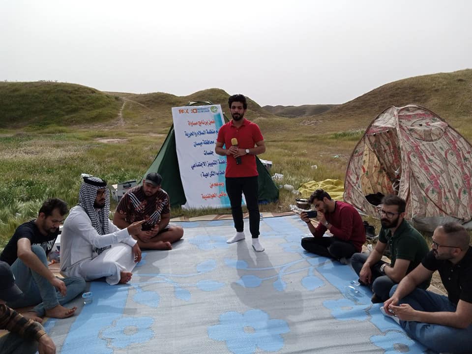 وفي اليوم الثاني تم التخييم في منطقة مفتوحة والتي تمتد تاريخها الى سومر ومملكة ميشان..تم إقامة جلسة حوارية حول خطاب الكراهية والتعريف بالاديان في العراق بصورة عامة وميسان بصورة خاصة.
