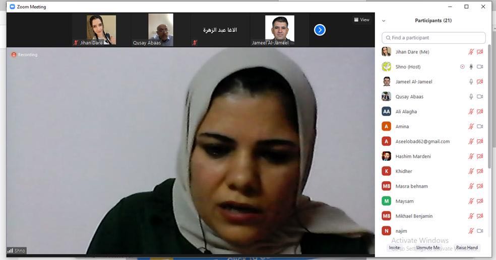 عقدت الجلسة في ٢٢ نيسان ٢٠٢١ بحضور السيد قصي عباس ممثل كوتا الشبك في مجلس النواب العراقي ورئيس لجنة حقوق الانسان النيابية في البرلمان العراقي، واستاذ خضر دوملي-عضو مركز دراسات السلام في جامعة دهوك ومدير ومنظمة الاعلام المستقل، واستاذ جميل الجميل-إعلامي وناشط مدني، وايضا بمشاركة مجموعة من اعضاء المجتمع المدني من الموصل والحمدانية.