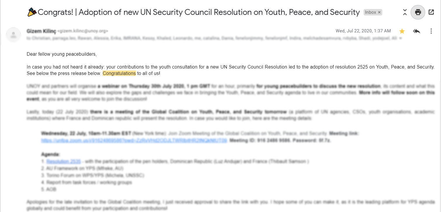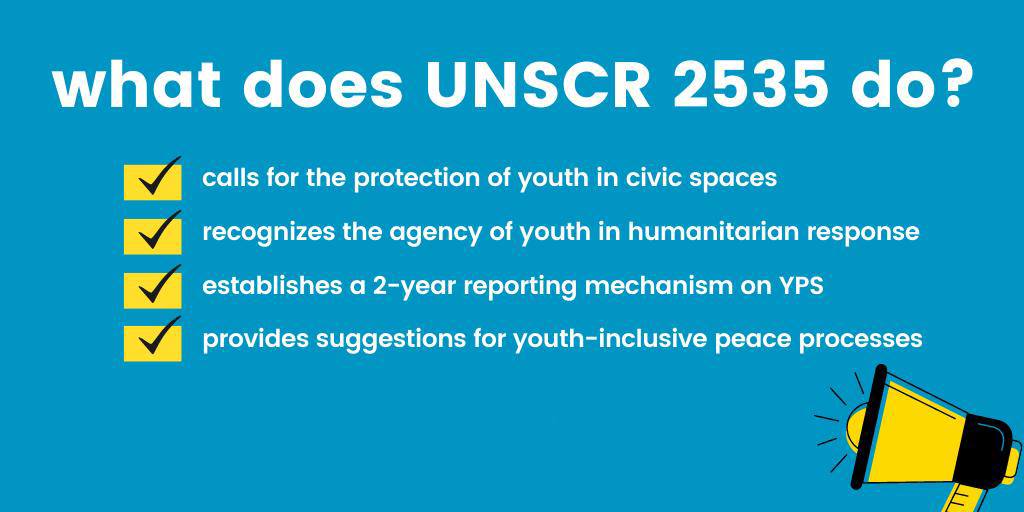 هذا ويذكر ان منظمة السلام والحرية كانت من المساهمين في تبني مجلس الأمن لهذا القرار المهم الذييدرك أن جيل شباب اليوم هو أكثر أجيال الشباب عددا في تاريخ العالم، وأن الشباب غالبا ما يشكلون غالبية السكان في البلدان المتضررة من النزاعات المسلحة، وإذ يسلم بضرورة مشاركة الشباب بنشاط في تشكيل السلام الدائم والمساهمة في تحقيق العدالة والمصالحة، وبأن اتساع شريحة الشباب من السكان يتيح عائدا ديمغرافيا فريدا يمكن أن يسهم في تحقيق السلام الدائم والازدهار الاقتصادي إذا اتُّبعت سياسات تشمل الجميع،وإذ يؤكد من جديد المسؤولية الأساسية للحكومات والسلطات الوطنية عن تحديد الأولويات والاستراتيجيات والأنشطة المنفذة لبناء السلام والحفاظ عليه وعن الدفع بها وتوجيهها.