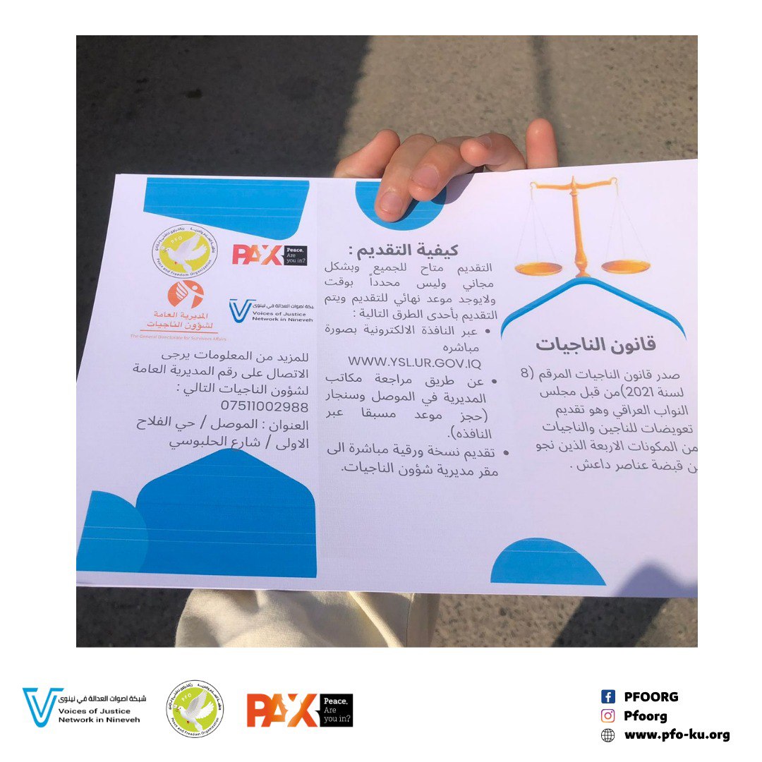 مضمون البروشور يتحدث عن قانون الناجيات و كيفية التقديم؟ وما هي الاستحقاقات بموجب قانون الناجيات الايزيديات؟ وعلى من يطبق هذا القانون؟ ايضا مراحل انجاز المعاملة.
