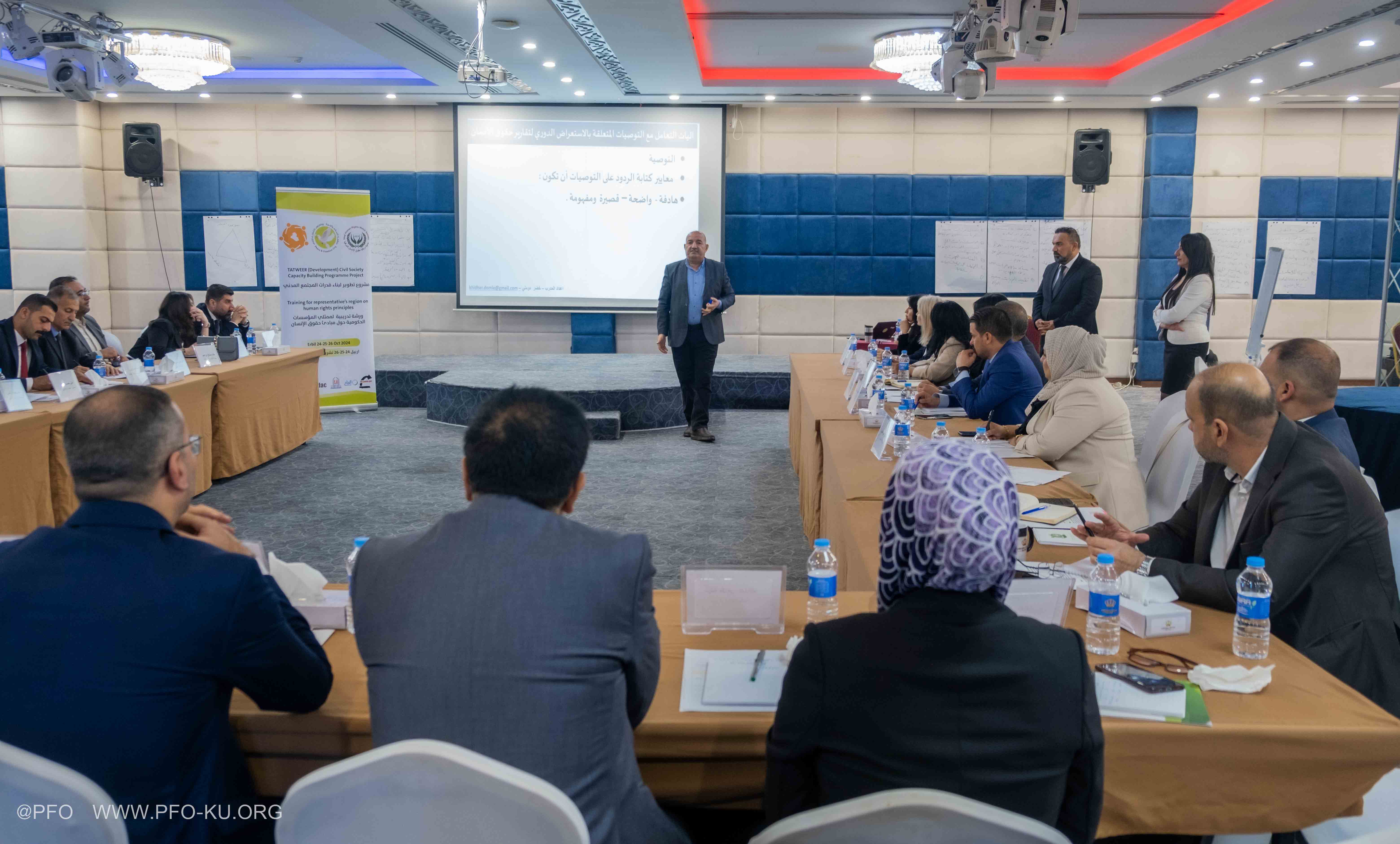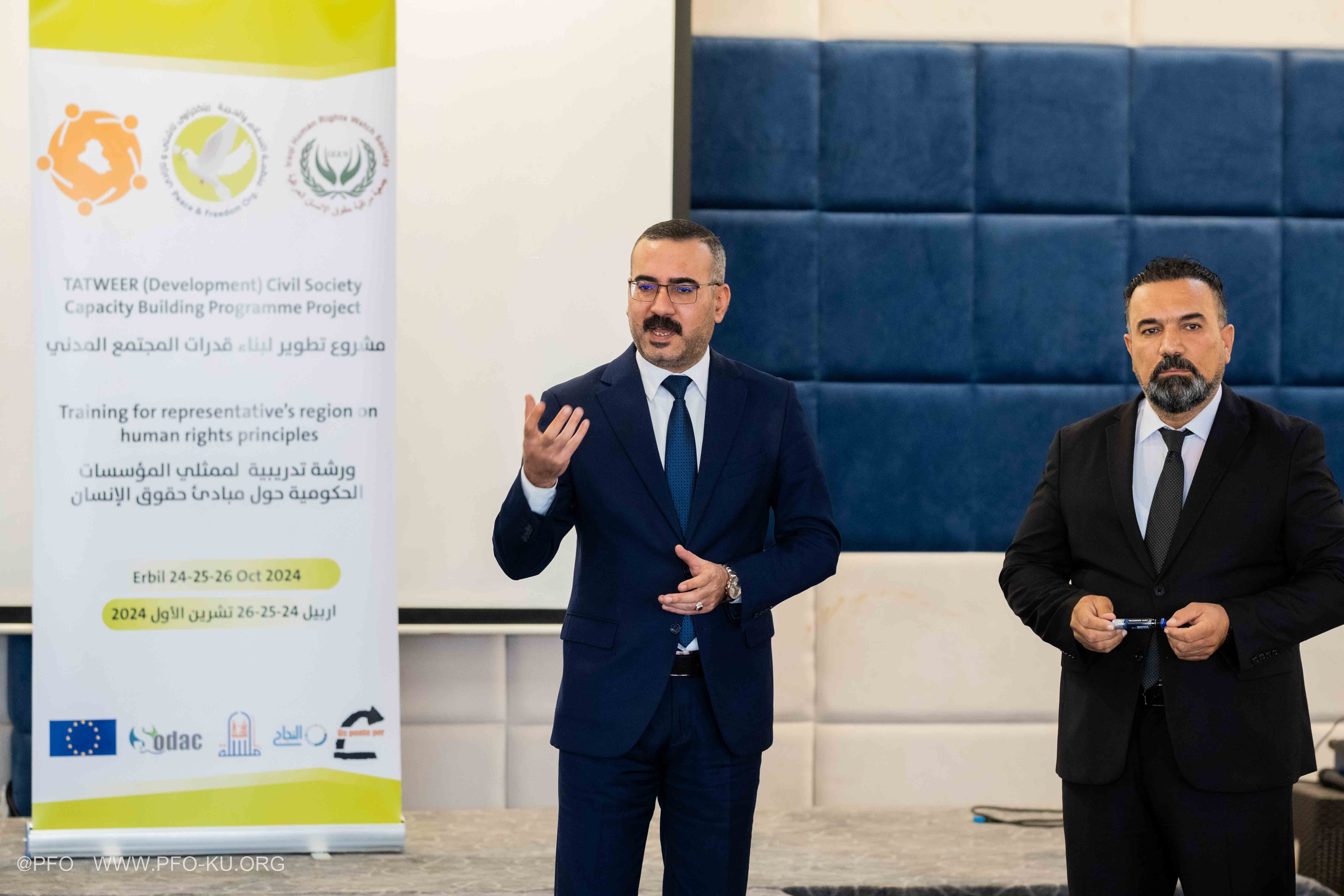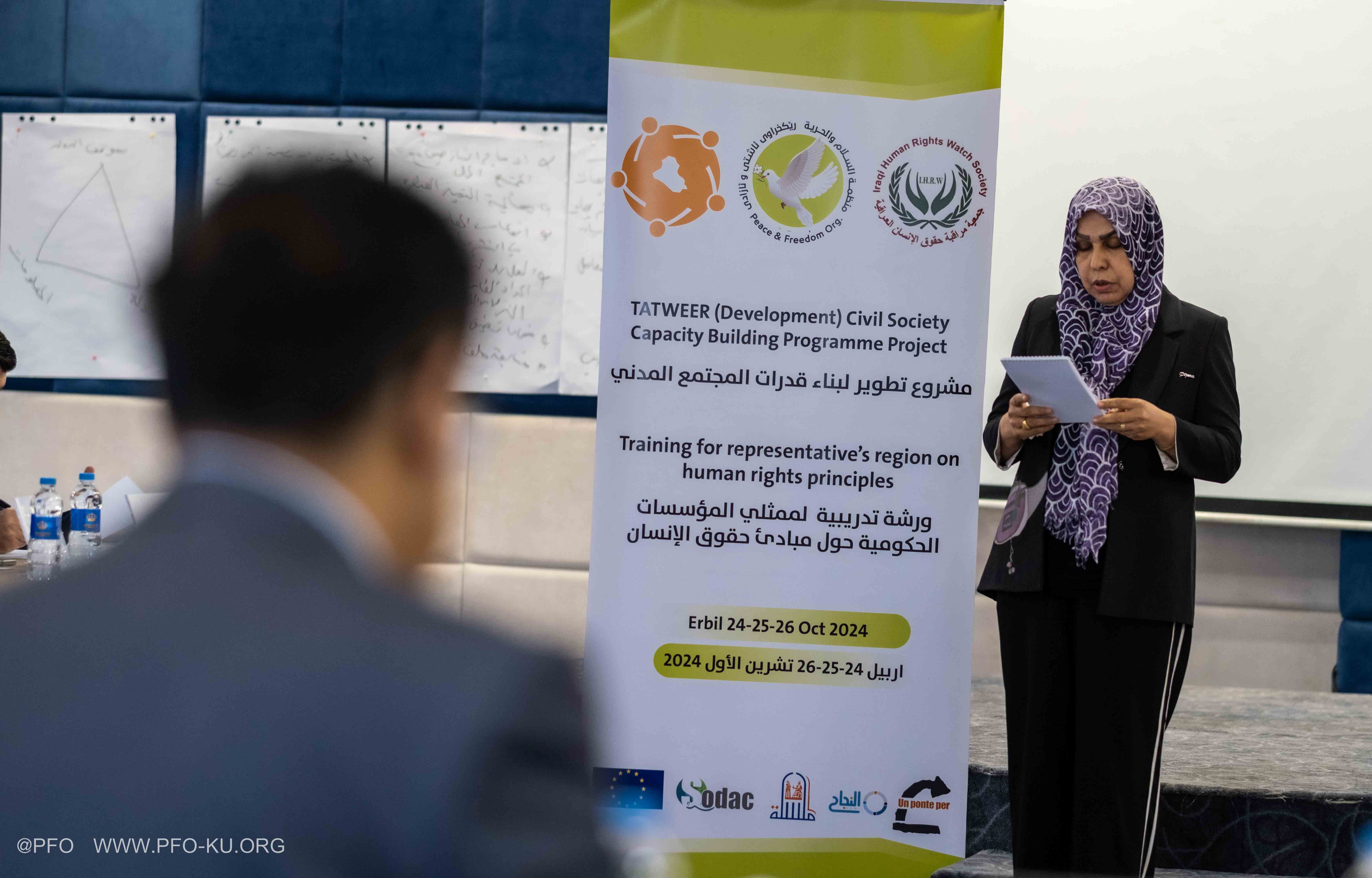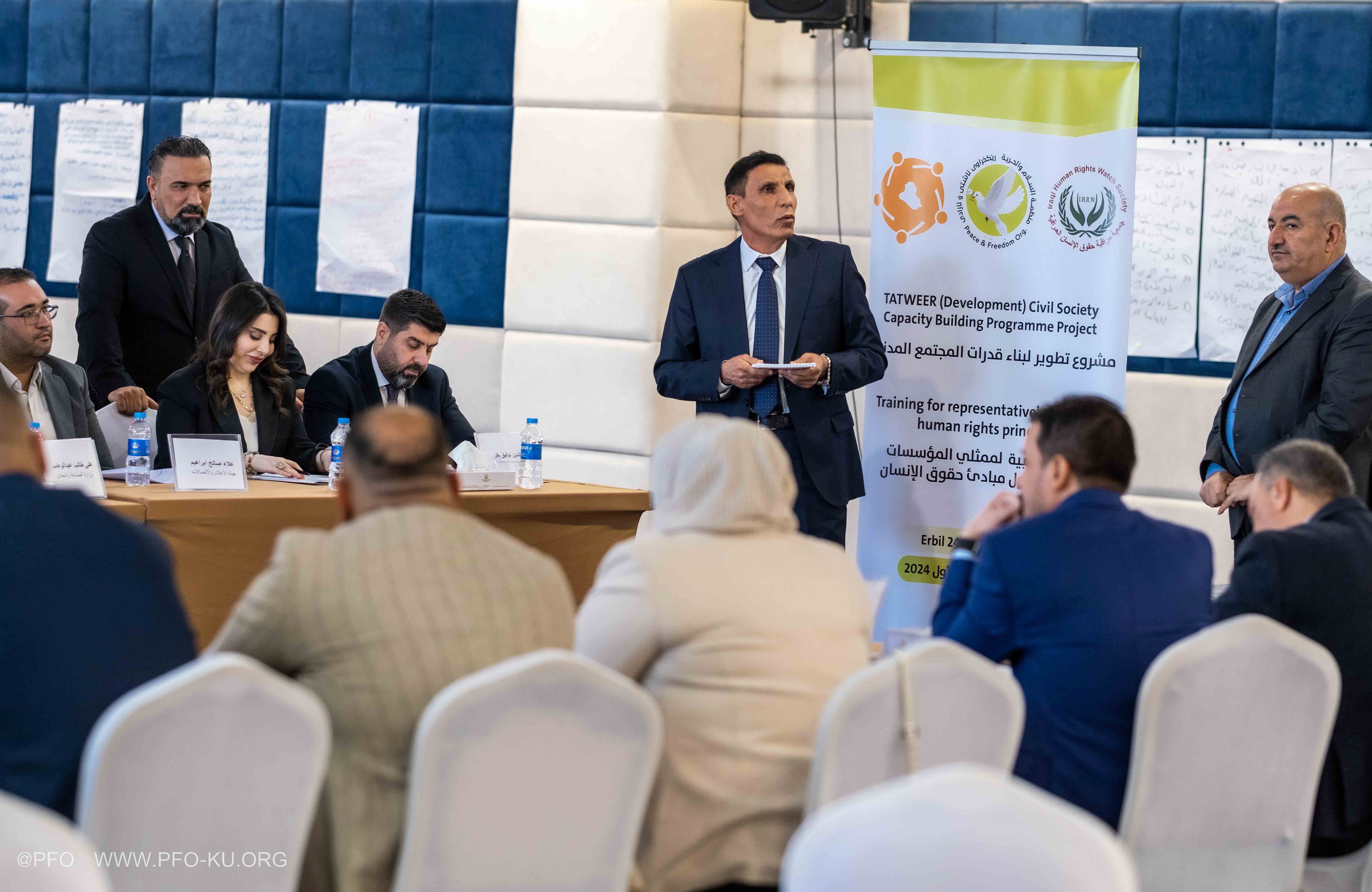 من أجل دعم وتعزيز الهياكل الوطنية المعنية بحقوق الإنسان أقامت منظمة السلام والحرية PFO وجمعية مراقبة حقوق الإنسان العراقية IHRW ضمن برنامج تطوير TATWEER Project بتمويل الاتحاد الأوروبي EU وتنفذه منظمة "جسر الی UPP الايطالية" بالشراكة مع منظمة المسلة، مركز النجاح ومنظمة شاقوفيان ورشة العمل الثانية لمدراء أقسام حقوق الإنسان في الوزارات والهيئات العراقية الخاصه بمتابعة تنفيذ التوصيات الدولية الخاصة بحقوق الإنسان بالتعاون مع وزارة العدل العراقية دائرة حقوق الإنسان ومكتب التوصيات الدولية في حكومة اقليم كوردستان بمشاركة ممثلين عن الأمانة العامة لمجلس الوزراء ووزارة الداخلية ومجلس القضاء الأعلى وهيئة النزاهة الاتحادية وجهاز الأمن الوطني ومستشارية الأمن القومي وجهاز مكافحة الإرهاب وهيئة الإعلام والاتصالات وهيئة الحشد الشعبي ووزارة المالية ووزارة الثقافة وديوان الرقابة المالية ودائرة الإصلاح العراقية في وزارة العدل ودائرة إصلاح الأحداث في وزارة العدل ووزارة الصناعة والمعادن ووزارة الأعمار والإسكان والبلديات والهيئة الوطنية للمساءلة والعدالة ومؤسسة الشهداء وديوان الوقف الشيعي وديوان الوقف السني وديوان وديوان أوقاف الديانات المسيحية مدة ثلاثة ايام ٢٤-٢٦ تشرين الأول 2024 في اربيل. وتضمنت ثلاثة محاور رئيسية ، تناول الأول اسس نظام معاهدات حقوق الأنسان ، والثاني الأليات الوطنية لإعداد التقارير والثالث التطبيق العملي والتحديات والحلول. حيث تفاعل المشاركون مع الفقرات التدريبة بشكل واضح بدافع تطوير مهاراتهم وكتابة الردود على التوصيات الدولية بشكل مهني .