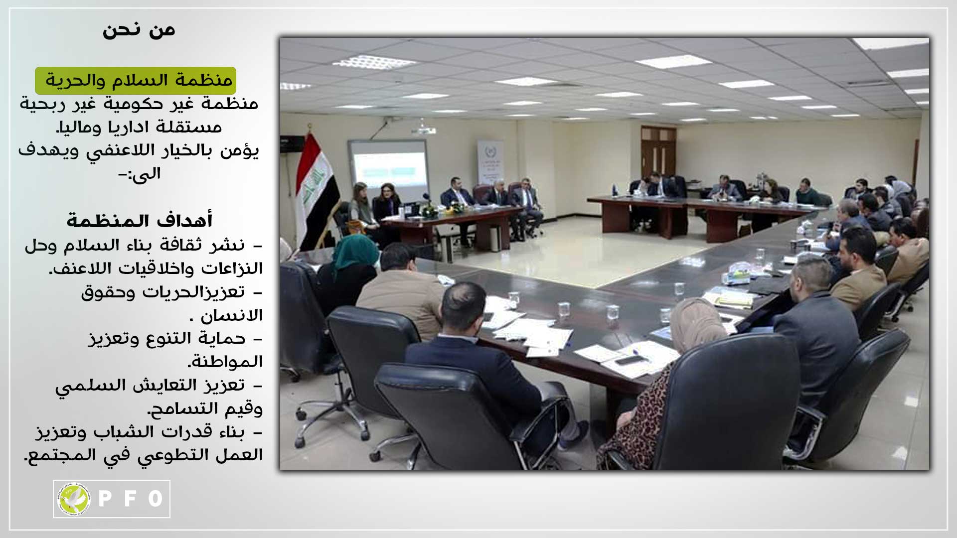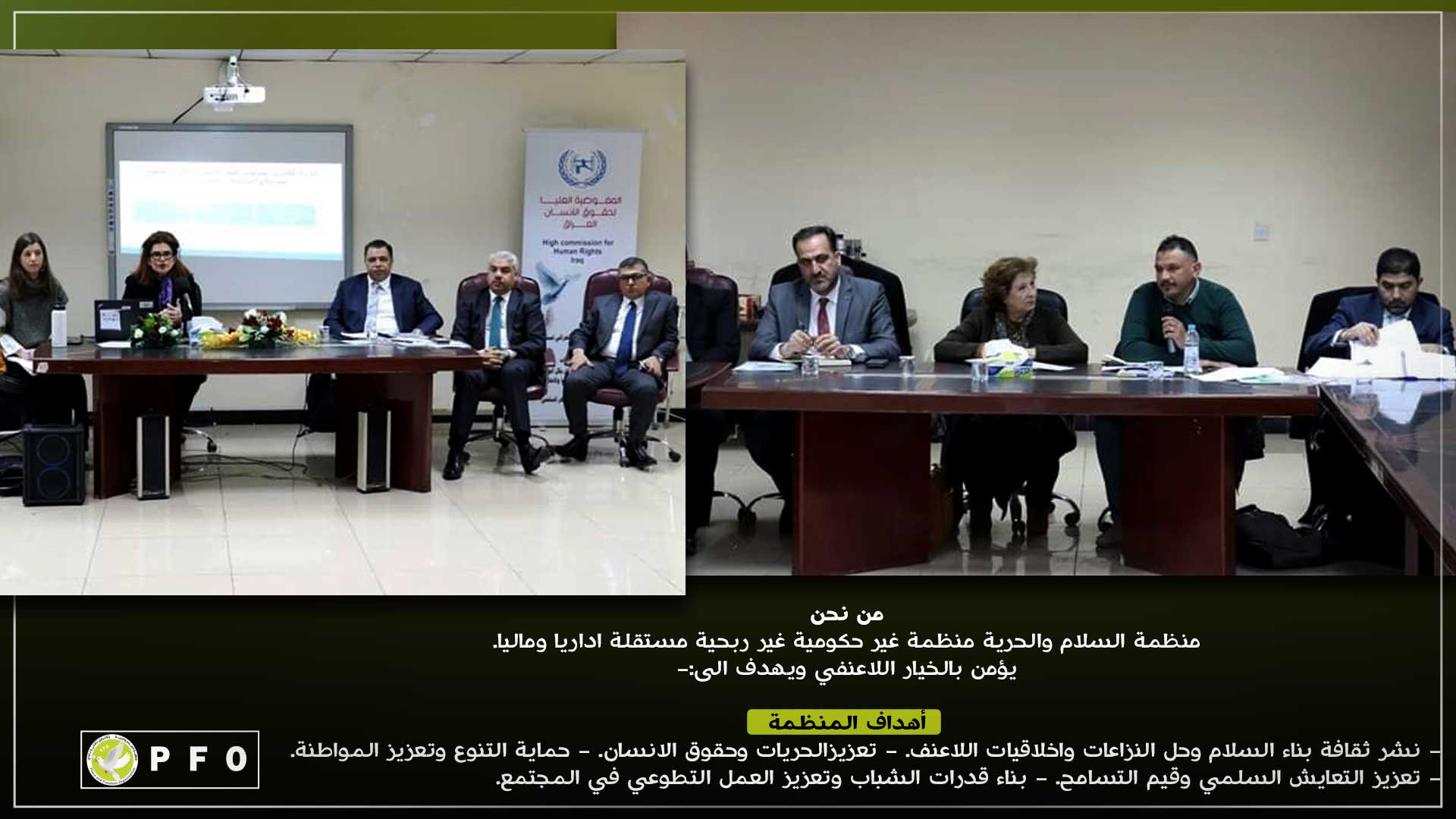 حضرت منظمة السلام والحرية PFO بتاريخ ١١ شباط ٢٠٢٠ اجتماعاً عقد في المقر الرئيسي للمفوضية العليا لحقوق الإنسان بالتعاون مع مكتب حقوق الانسان في بعثة الأمم المتحدة لمساعدة العراقUNAMI حول آلية تقديم التقارير الى اللجنة المعنية بحقوق الإنسان .