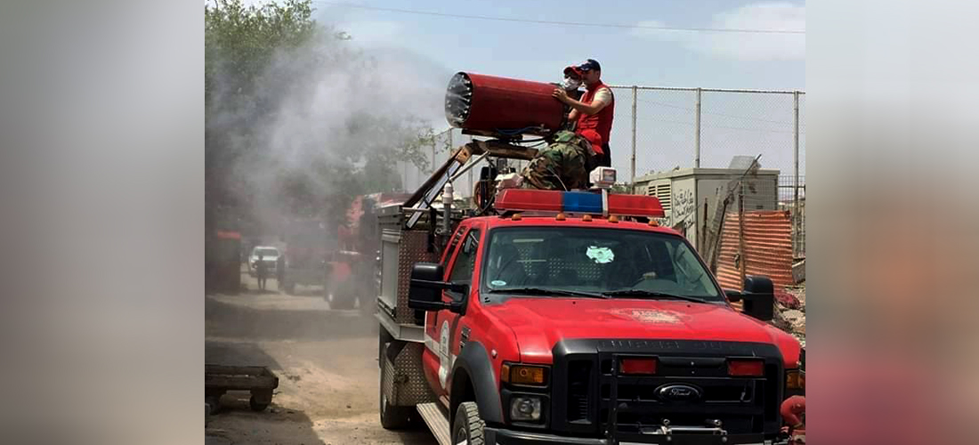 السلام والحرية تدعم الدفاع المدني في بغداد في٢٤ حزيران ٢٠٢٠ رتل طوارى الدفاع المدني و مركز اطفاء الحبيبية ينفذون حملة تعقيم وتطهير لمنطقة الحبيبية بالكامل و شارع المعارض بشكل منفرد حيث تم استخدام مدفع التضبيب الخاص بالمنظمة من قبلهم لتطهير الشوارع والارصفة والساحات العامة.
