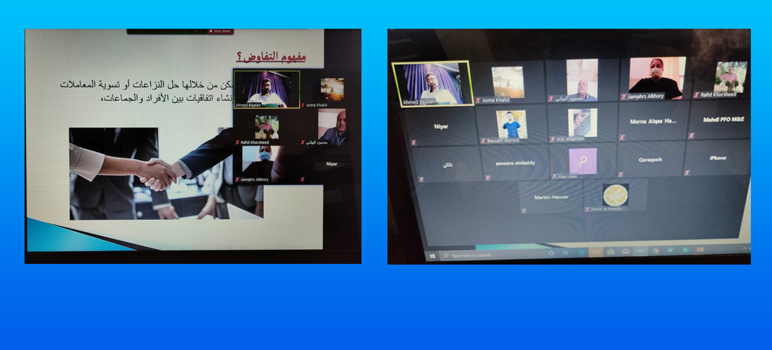 المدرب احمد باجلان مستشار فريق المدافعة في منظمة السلام والحرية تناول المواضيع المرتكزة عن طرق التفاوض وحل النزاعات، وأساليب فن الإقناع مع صناع القرار الحكومي َوغيرهم، تضمن أيضاً مشاركات لكلا الجنسين لتبادل الأراء وطرح العديد من الأفكار التي تواجه العمل وتحديات فريق المدافعة في محافظة نينوى.