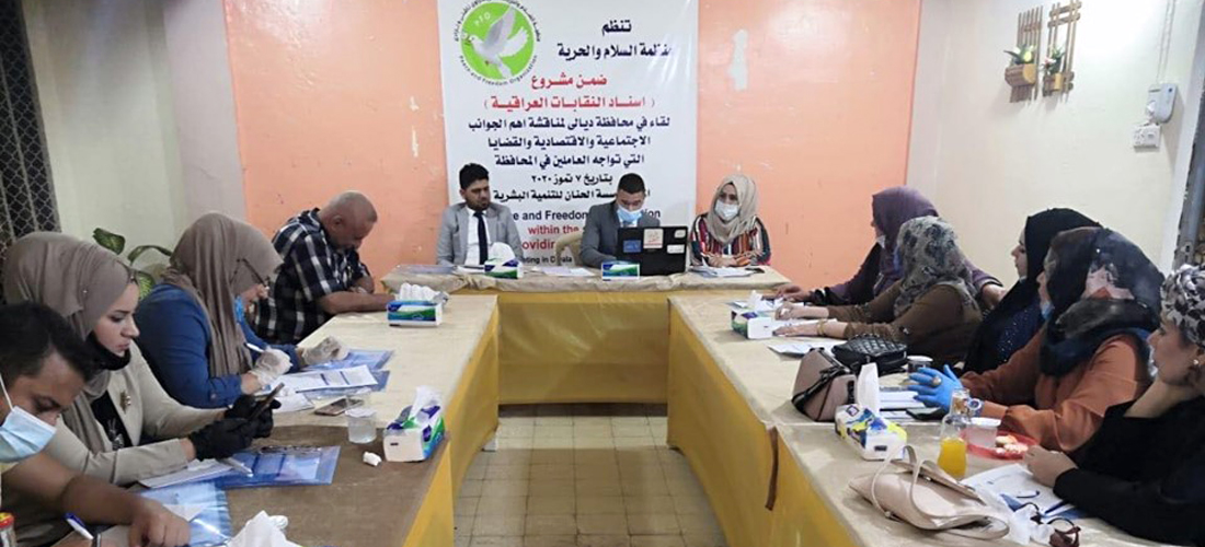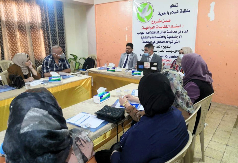 ضمن مشروع اسناد النقابات العراقية الذي تنفذه منظمة السلام والحرية في خمسة محافظات عراقية اختتمت يوم الثلاثاء ٧ تموز 2020 في محافظة ديالى جلسة مناقشة الجوانب الاقتصادية والاجتماعية التي يواجهها العمال في ظل جائحة كورونا والظروف الاقتصادية التي تمر بها البلاد. حيث شارك مجموعة من ممثلي الاتحادات والنقابات العمالية في المحافظة بالاضافة الى مجموعة من النشطاء والمحامون وجهات حكومية ايضا