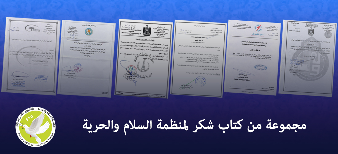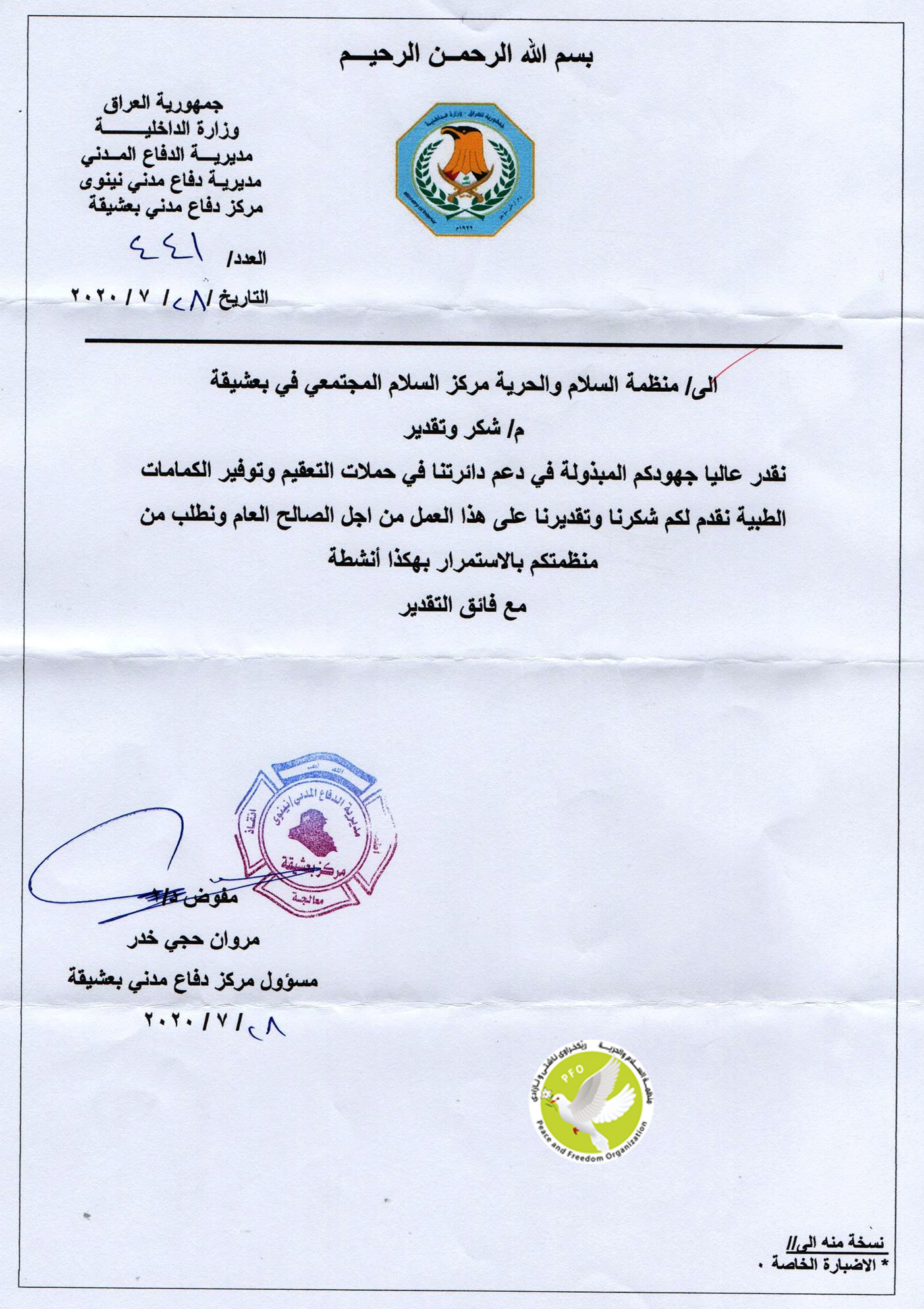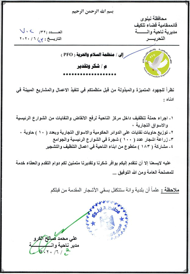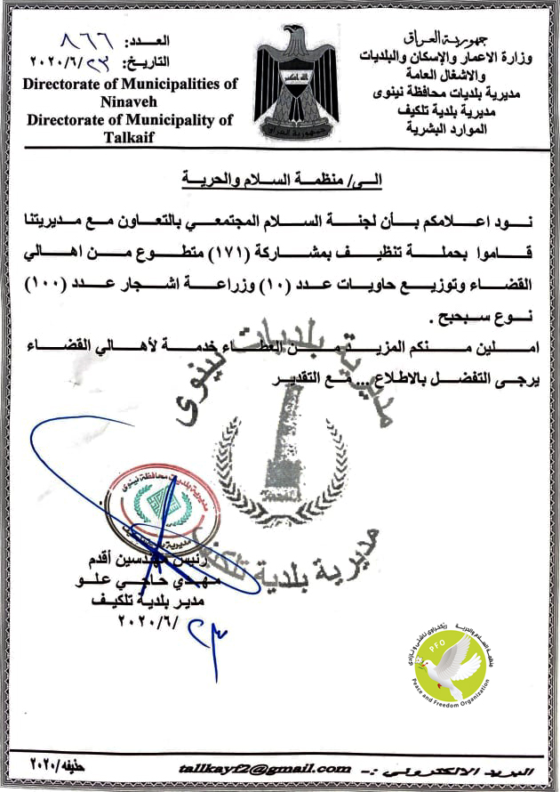منظمة السلام والحرية تستلم كتاب شكر وتقدير من السلطات المحلية ودوائر الدولة في نينوى وسهل نينوى ولذلك لجهودها وعملها الدؤوب لخدمة المحافظة.