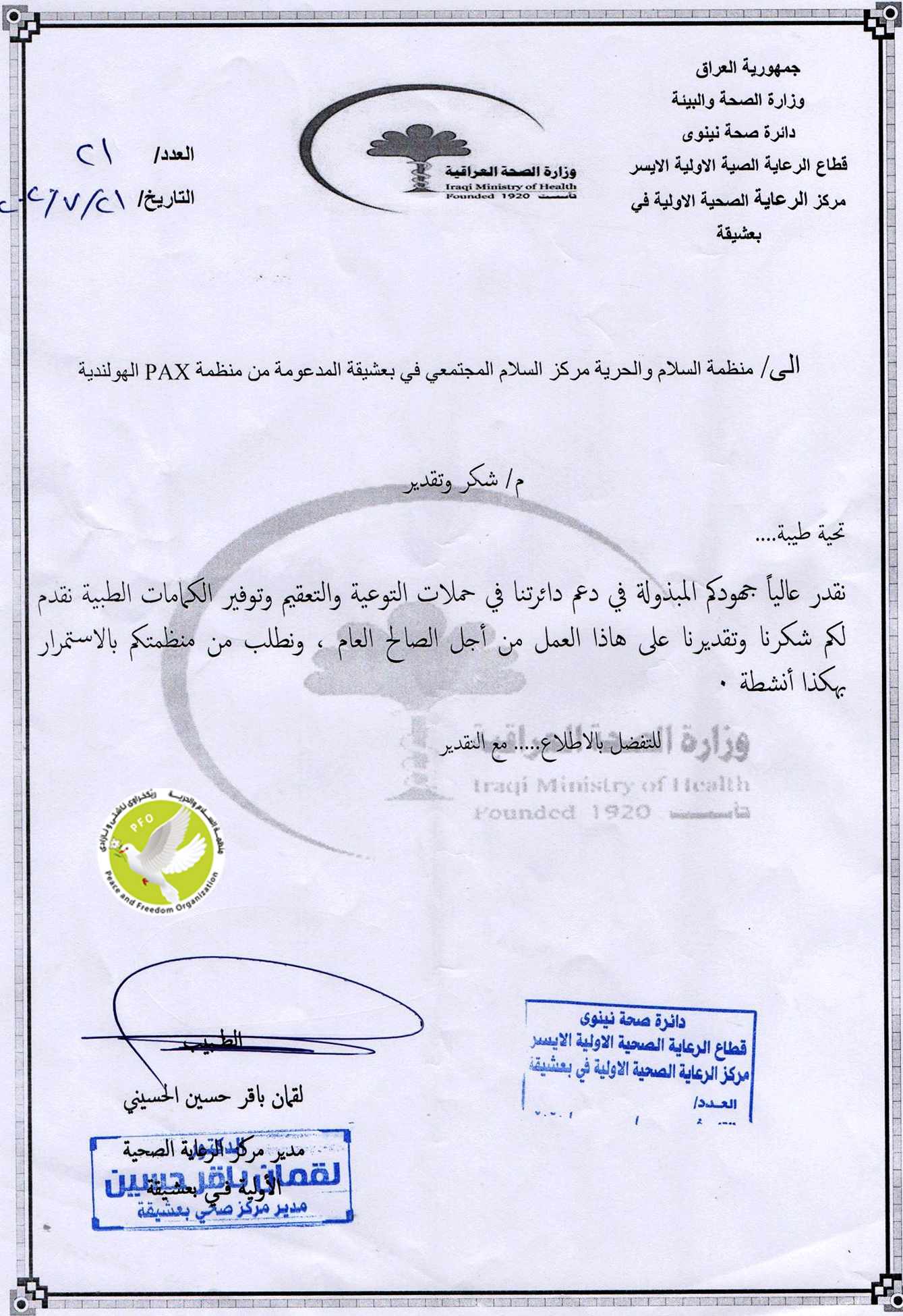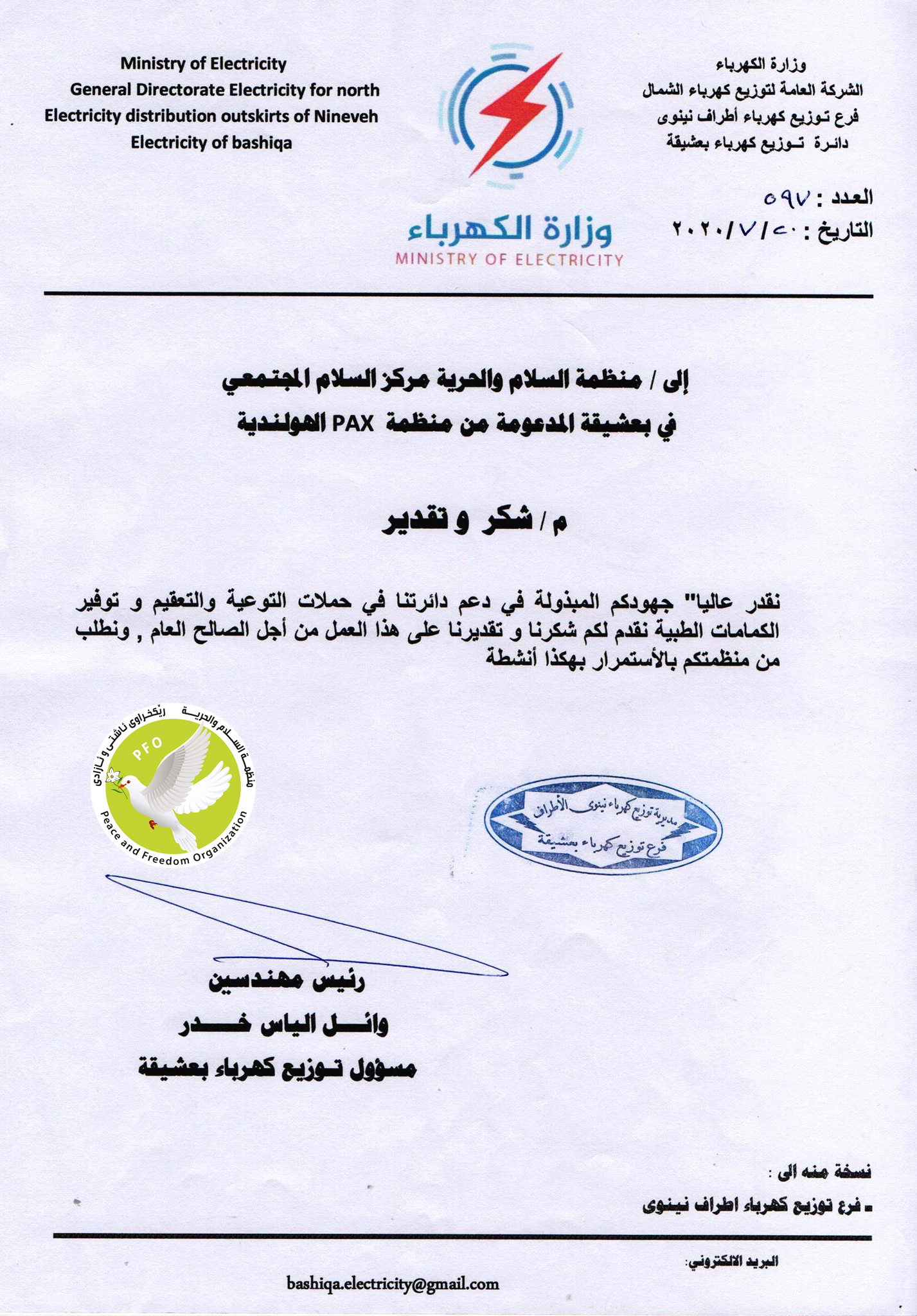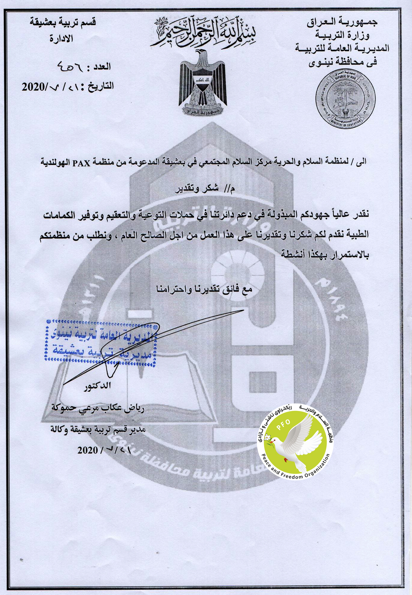 منظمة السلام والحرية تستلم كتاب شكر وتقدير من السلطات المحلية ودوائر الدولة في نينوى وسهل نينوى ولذلك لجهودها وعملها الدؤوب لخدمة المحافظة.
