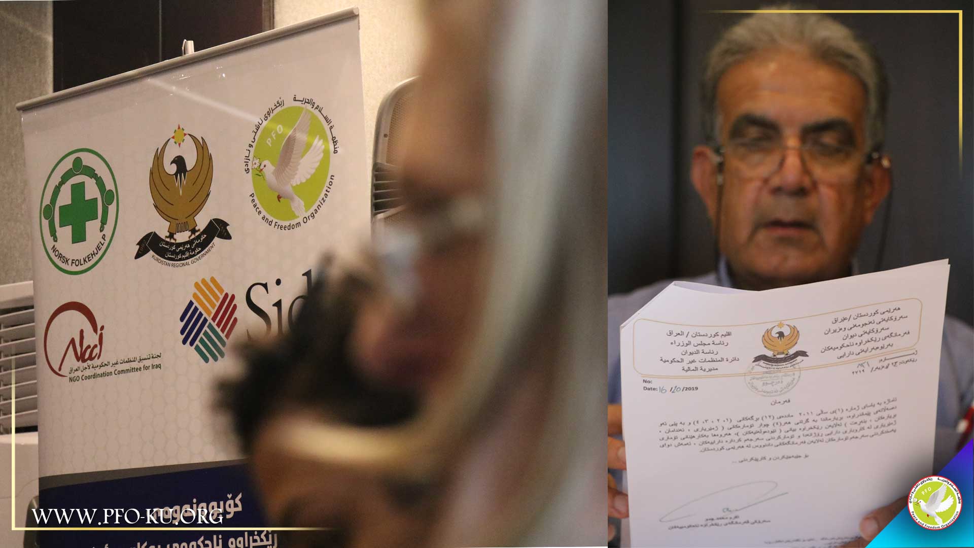 رێكخراوی ئاشتی و ئازادی بەهەماهەنگی رێكخراوی NCCI و فەرمانگەی رێكخراوە ناحكومییەكانی هەرێم لەشاری هەولێر رۆژی 17ـی نۆڤەمبەری 2019 كۆبونەوە فراوانەكەی رێكخست كە تیایدا بۆچونی رێكخراوی ئاشتی و ئازادی لەبارەی كێشە و گرفت و رۆتینەكانی بەردەم كاروباری رێكخراوە ناحكومییە نێودەوڵەتییەكان لەهەرێمی كوردستان خرایە روو، پاشان نوێنەرانی ئەنجومەنی وەزیرانی هەرێمی كوردستان و فەرمانگە بۆچونی خۆیان لەبارەی كۆبونەوەكە خستە روو كە خوازیاری سەرنج و تێبینی نوێنەرانی رێكخراوە ناحكومییە نێودەوڵەتییەكانبوون.