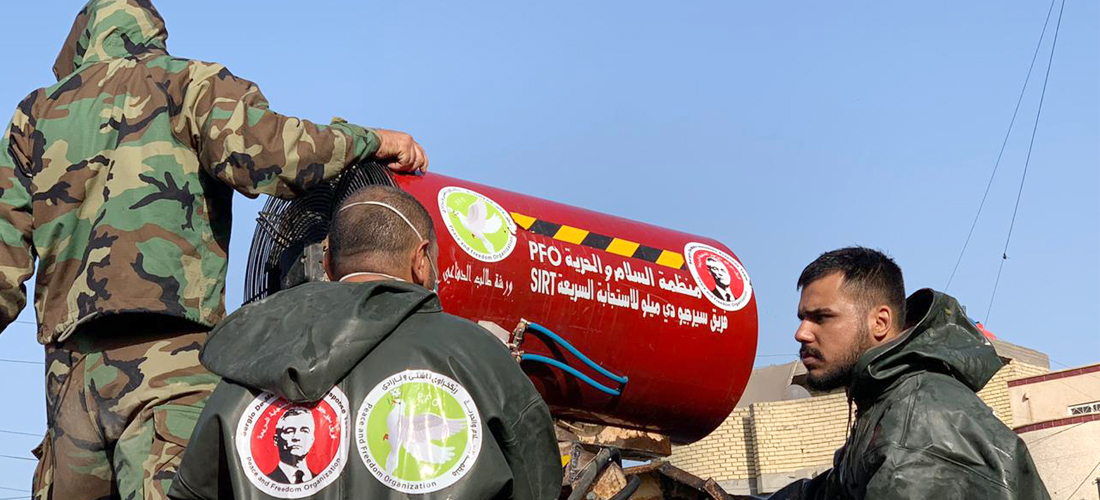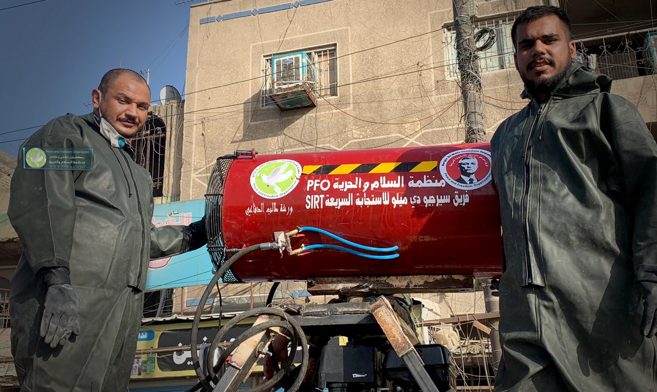 Peace and Freedom in partnership with the Baghdad Women's Association and the Emergency al-Rusafa Team (Elite Team) in the Directorate of Civil Defense Ending the first campaign in Sadr City where PFO ended the first sterilizing campaign in Al - Sadr City that included sectors 10, 56 and 57. Sergio de Mello SIRT staff team, completed the implementation of the joint plan by sterilizing the three sectors mentioned above, where #PFO team and Al-Rusafa Emergency Department at the Civil Defense Directorate began the tasks of the plan at 4:00 a.m. and continued until 8:30 a.m.