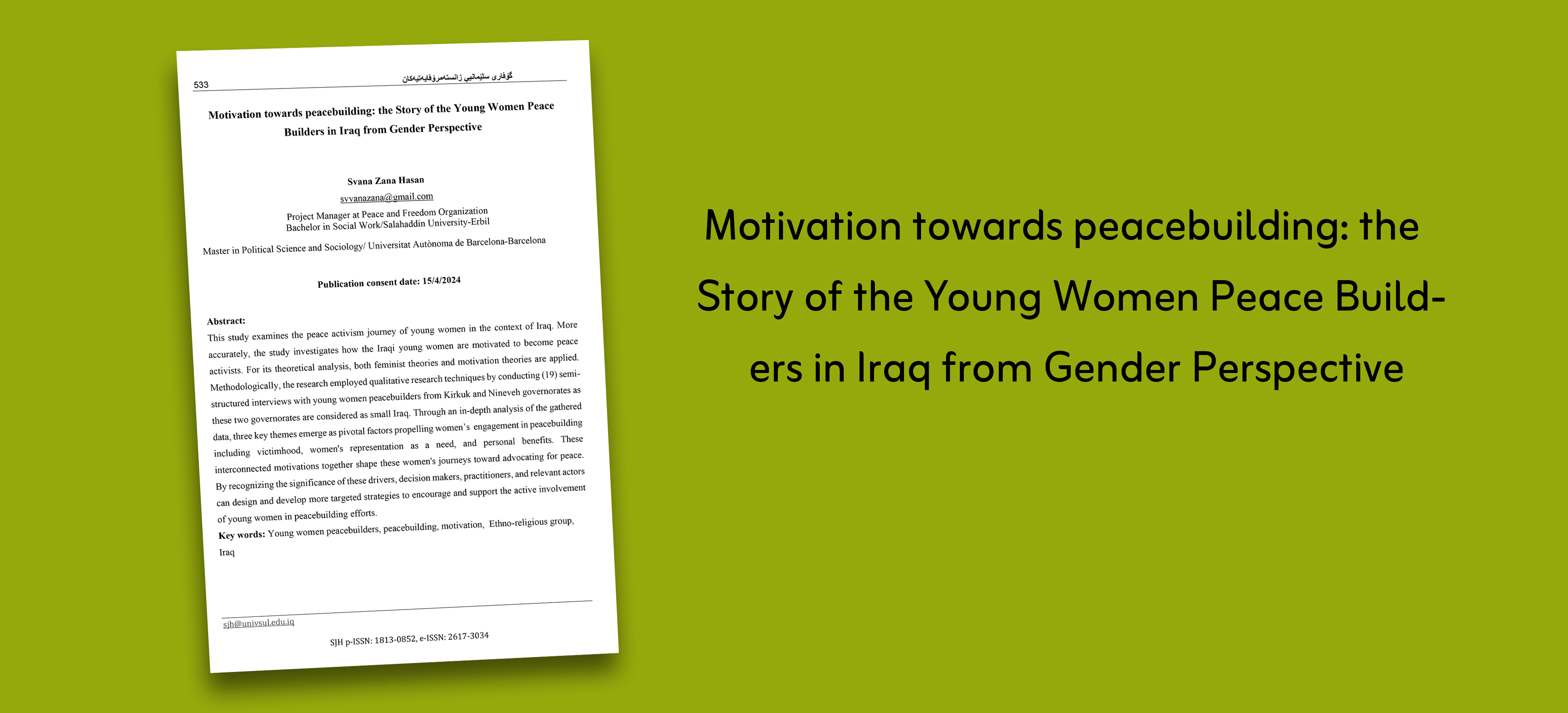 This study examines the peace activism journey of young women in the context of Iraq. More accurately, the study investigates how the Iraqi young women are motivated to become peace activists. For its theoretical analysis, both feminist theories and motivation theories are applied.