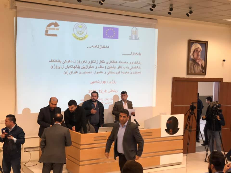 رۆژی ٤/١٢/٢٠١٩ لەشاری دهۆك گروپی پێكهاتە و ئاوارەكانی كۆڕبەندی كۆمەڵایەتی كوردستان/ رێكخراوی مەسەللـە بەهاوبەشی زانكۆی نەورۆز پانێلكیان لەژێر ناونیشانی (ماف و داخوازیەكانی پێكهاتەكان لەهەمواری دەستوری عێراق) سازكرد كە ژمارەیەك لەمامۆستایان و قوتابیانی زانكۆ و كەسایەتی روناكبیری و چالاكوانانی پێكهاتەكان ئامادەیبوون. دوای پێشكەشكردنی ژمارەیەك سیمینار و نوسینەوەی راسپاردە و سەرنجی بەشداربوان بڕیاردرا رادەستی لیژنەی هەمواركردنەوەی دەستور لەئەنجومەنی نوێنەرانی عێراق بكرێت.